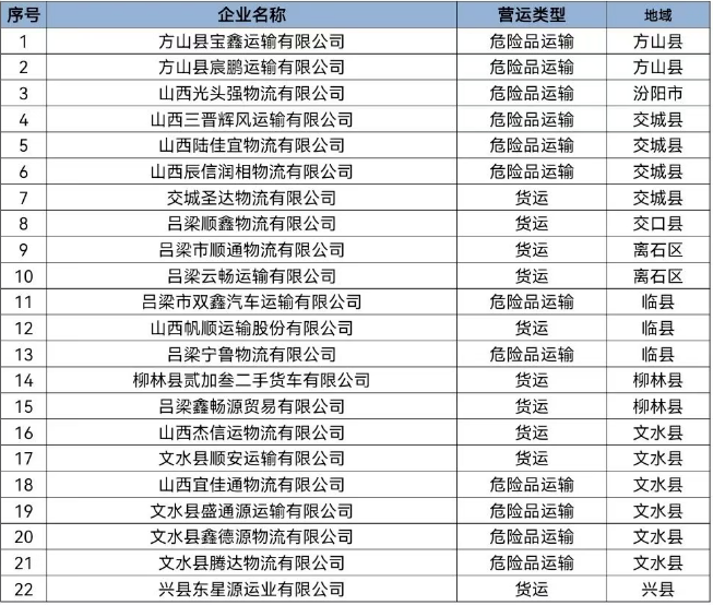 为进一步加强重点运输企业源头监管,推动企业落实安全管理主体责任,有效预防和减少道路交通事故。根据公安部交管局大数据研判平台推送,吕梁市2026年1月份涉及高风险运输企业为22家(危化品运输企业12家),连续3个月被评估为高风险运输企业6家,现予以全市曝光。请相关企业责任人高度重视,加强内部安全风险管控,认真开展驾驶人安全教育,及时消除道路交通安全隐患,扎实落实安全主体责任,特别加强危险化学品运输车辆的安全管理工作。