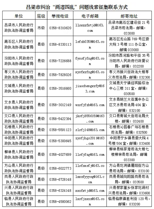 附件:吕梁市纠治“两违四乱”问题线索征集联系方式