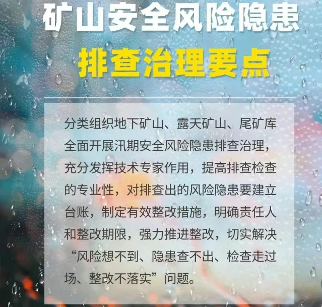面对当前“七下八上”防汛关键期,国家矿山安全监察局山西局研究制定《进一步加强汛期矿山安全防范的工作措施》,要求从即日起,全省矿山企业立即开展汛期井上下全覆盖隐患排查,确保矿山安全度汛。